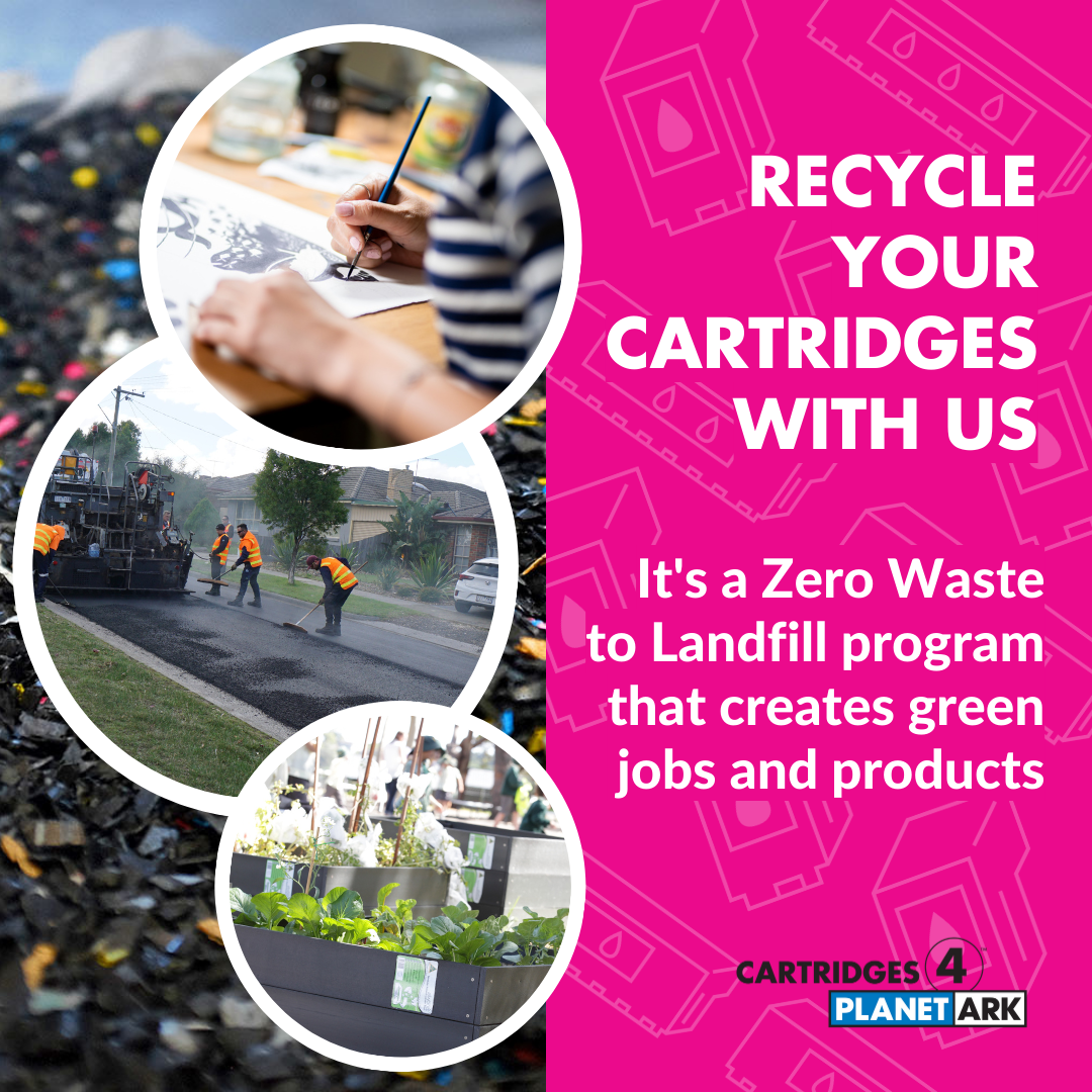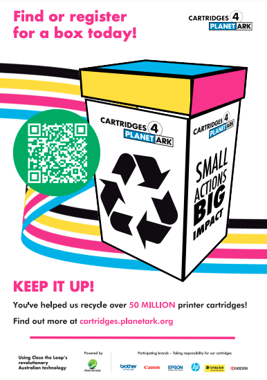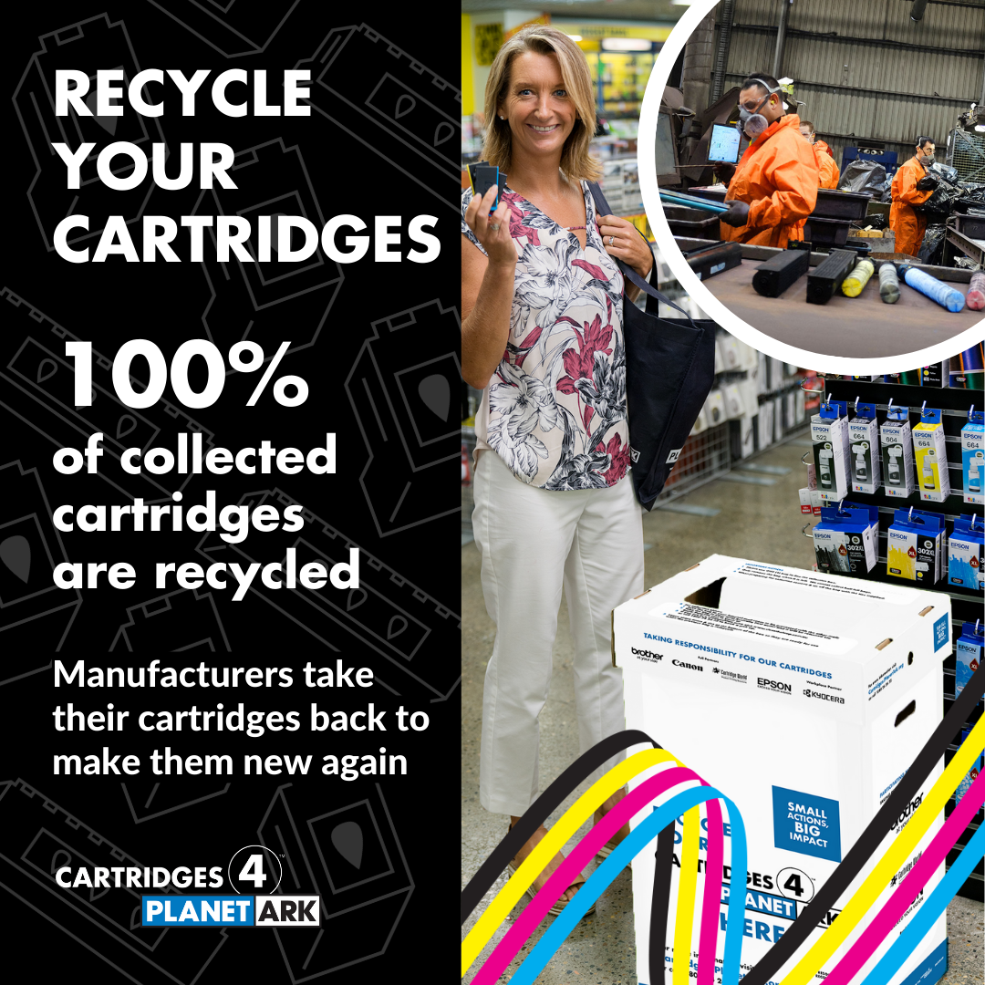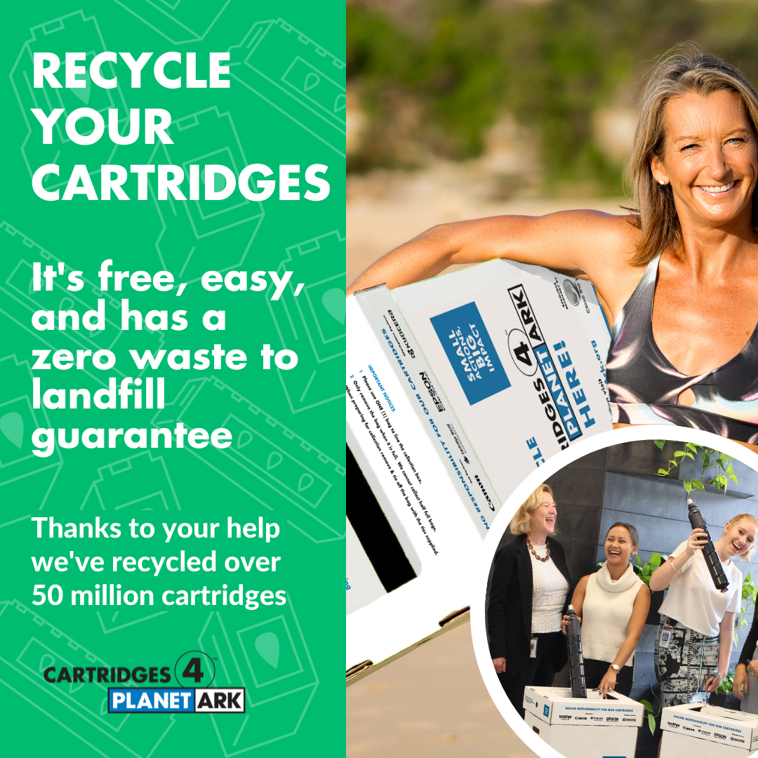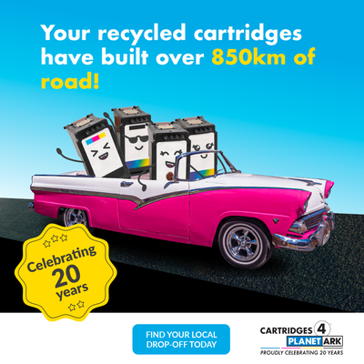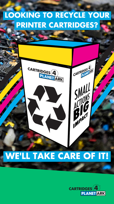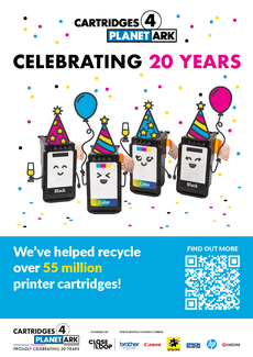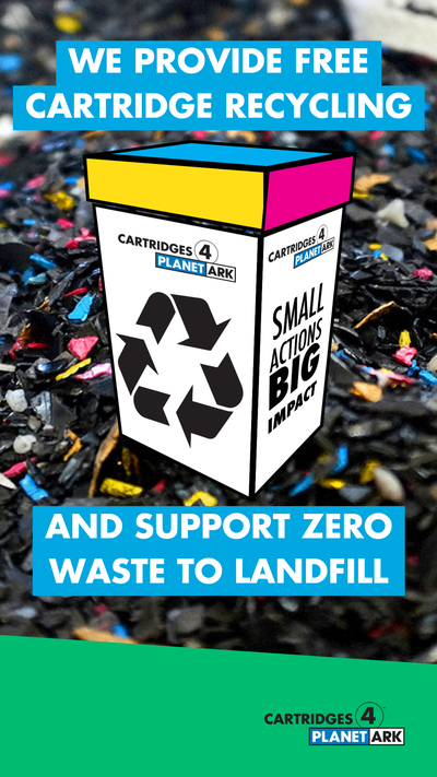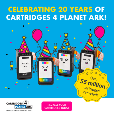 Cartridges 4 Planet Ark is celebrating 20 years of printer cartridge recycling in 2024. We have created a range of materials, to mark the occasion, which you are free to use as a supporter of the program. Use them to share your commitment to Zero Waste to Landfill recycling solution by tagging @PlanetArk and using #cartridges4planetark.
