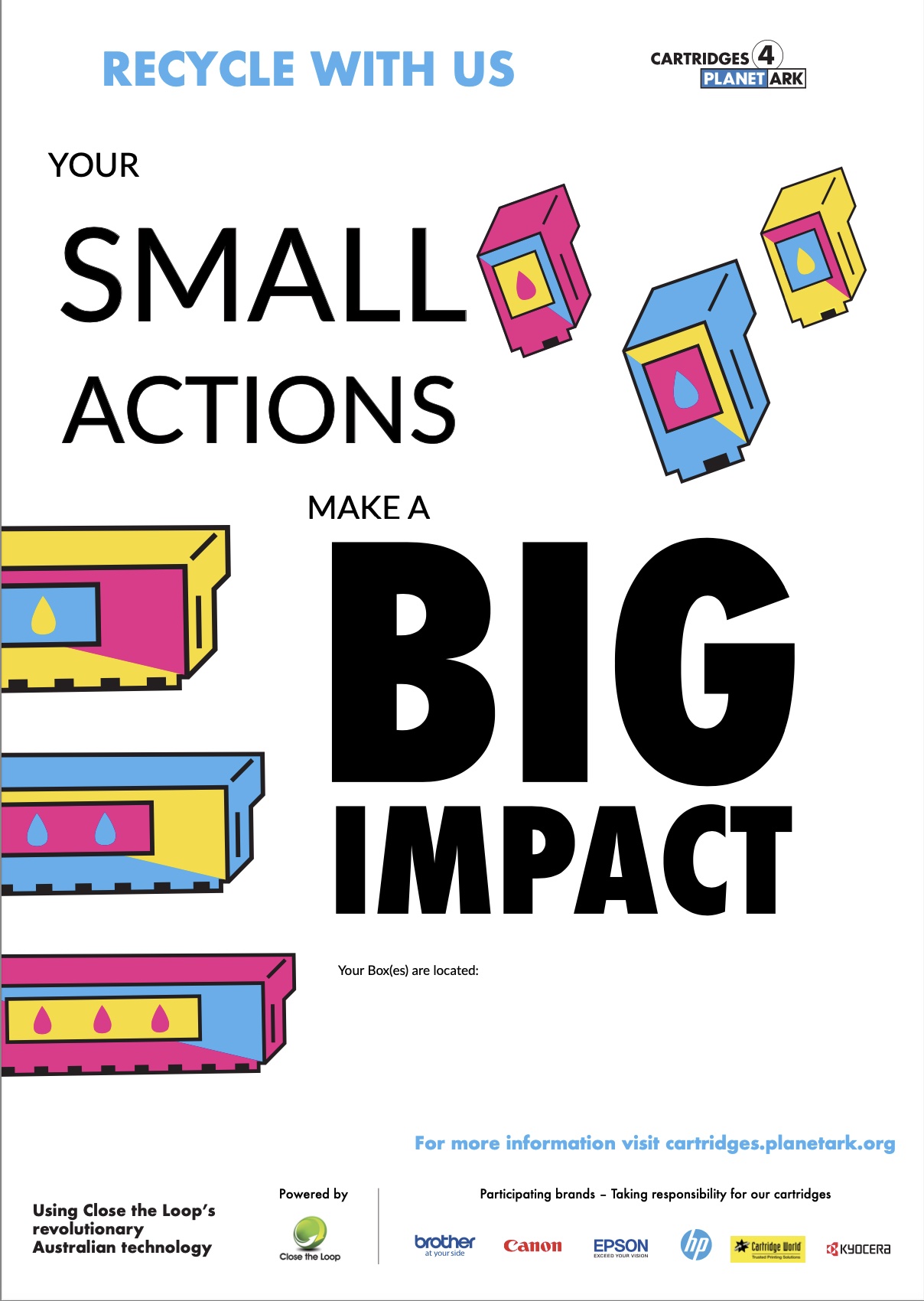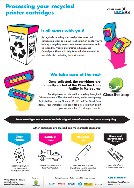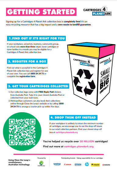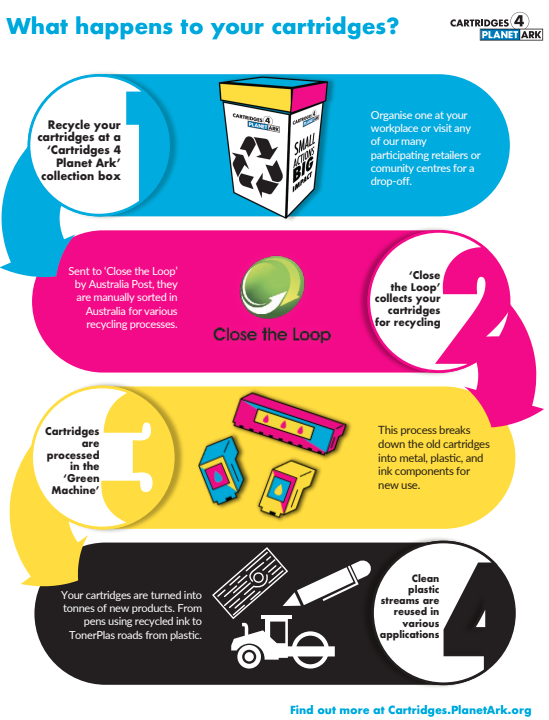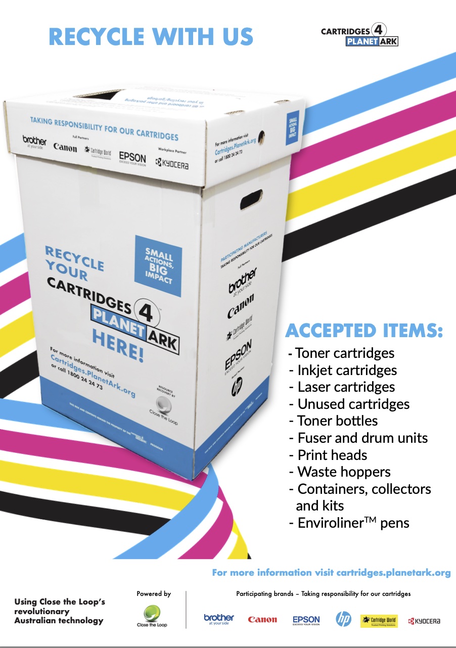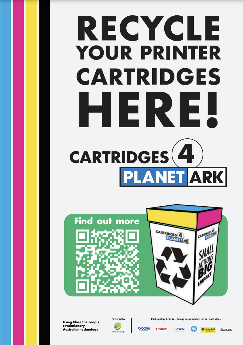 Cartridges 4 Planet Ark has put together this kit to provide a one stop shop for our videos, social media graphics, posters and more. This resource kit has links to different materials that can be used to promote the program.