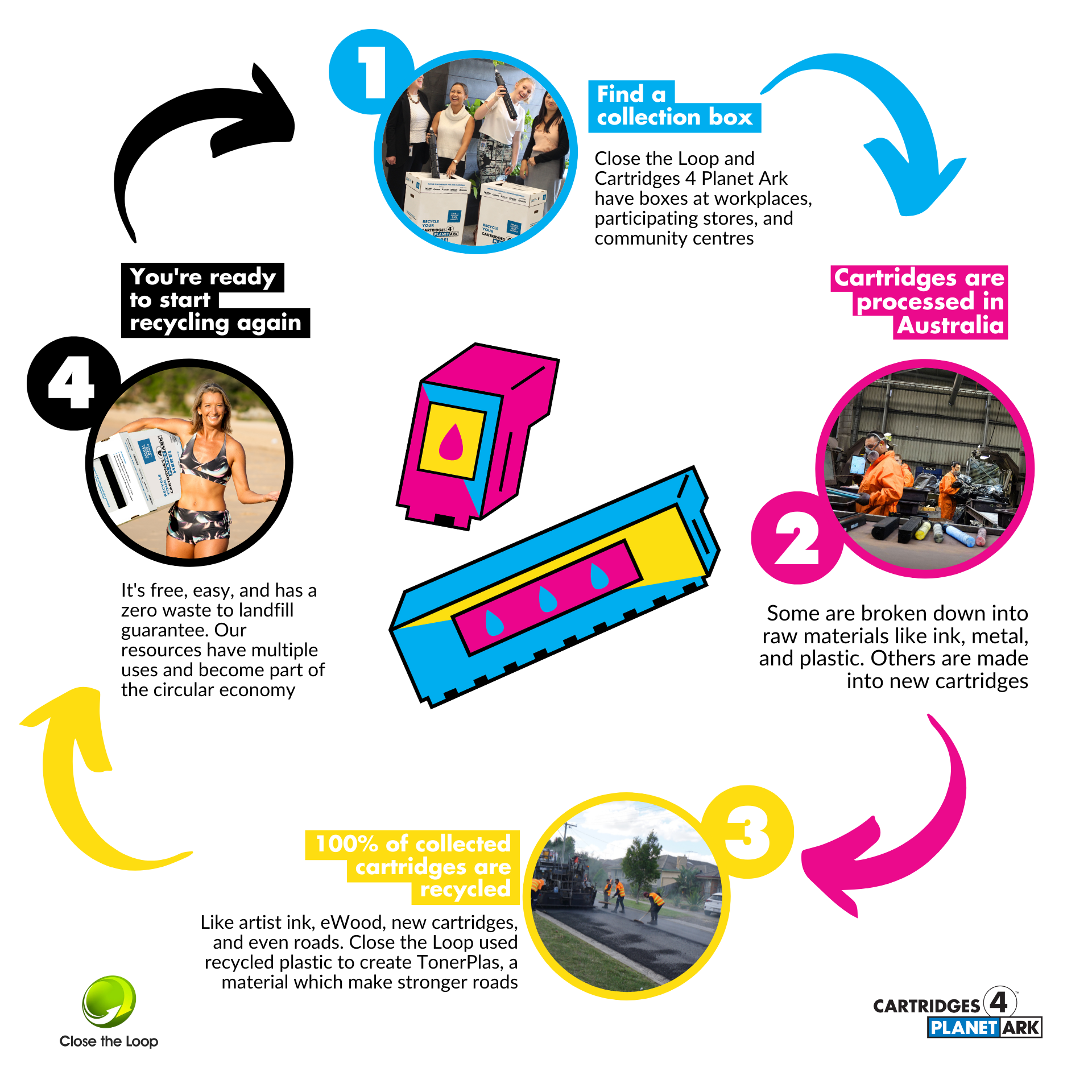Printer cartridges are made up of a complex combination of plastics, metals, foam, ink and toner. Throwing them into landfill represents a waste of resources and contributes to the growing problem of electronic waste. By recycling your cartridges you are helping to reduce this waste.