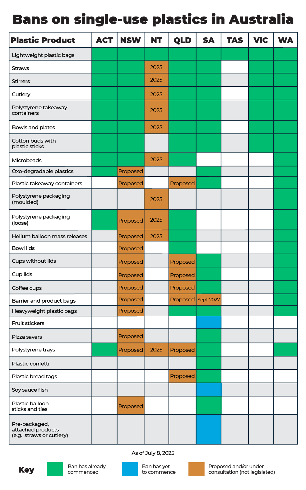 Certain kinds of single-use plastic products are banned across Australia (Tasmania is the only state that hasn't committed to a ban). Lightweight plastic bags are banned in every state and territory, including Tasmania. Bans on other kinds of single-use plastics and timelines for phasing them out depend on which part of Australia you live in.